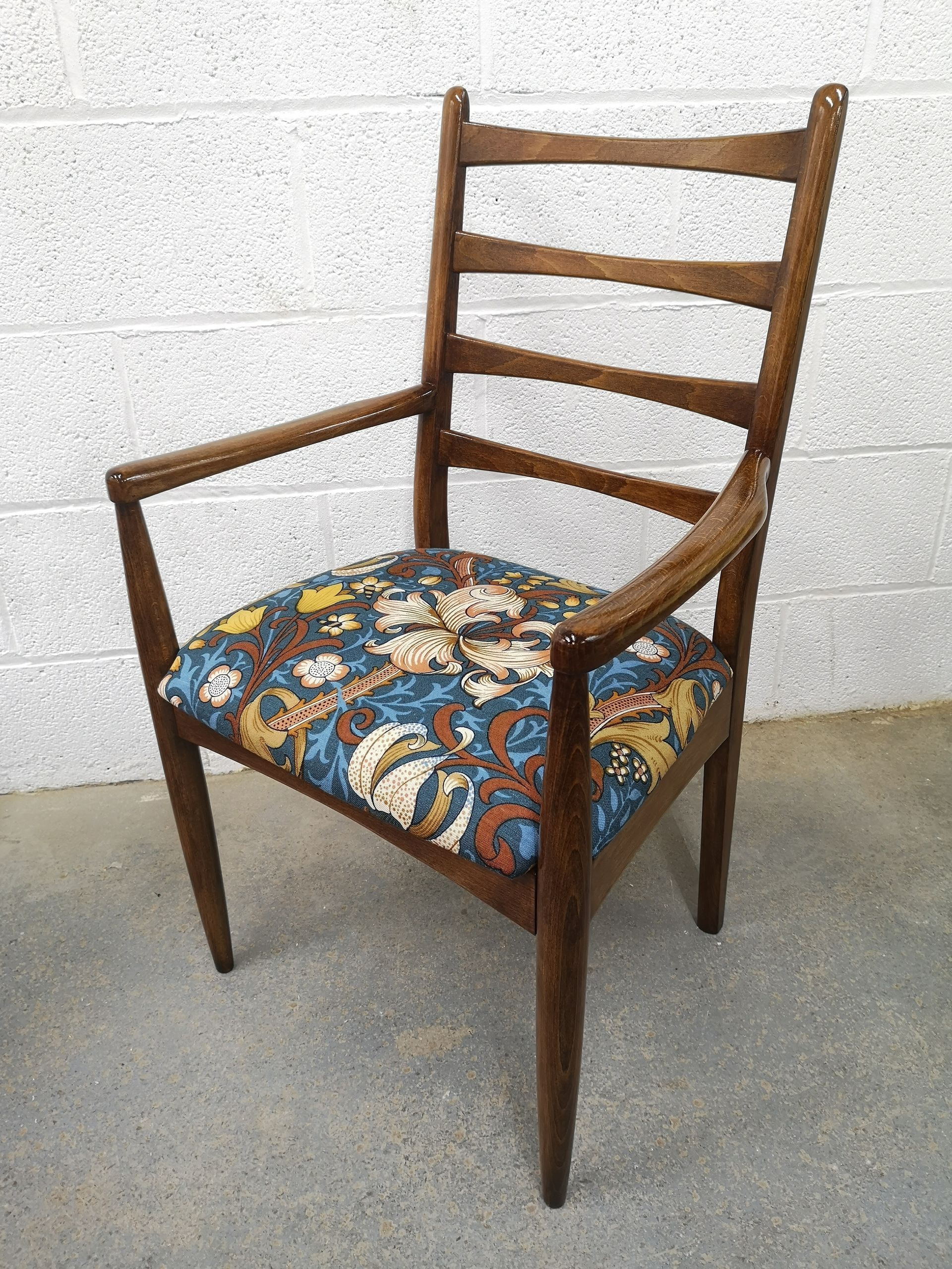 Fully restored this beautiful beech elbow chair has been French polished & upholstered in a vintage Willaim Morris fabric. £245 Plus a delivery quote or you are welcome to collect. H 45cm, w 45cm, d 45cm. Arm h 63cm from floor. Full h 89cm to middle of back.